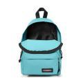 Zaino Eastpak da bambina a tinta unita in colorazione cielo. Modello con bretelle regolabili, manico singolo, chiusura con cerniera anteriore e marsupio frontale con piccolo logo del brand in contrasto di colore. Capienza 10L.