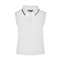 Polo Guess da donna a tinta unita in colorazione bianco con classica scritta del brand all'interno del colletto in contrasto di colore. Modello con classico colletto, chiusura sul davanti con bottoni, senza maniche e fondo con orlo dritto. Tessuto in misto Cotone.