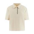 Polo Guess da donna a tinta unita in colorazione panna con classica scritta del brand cucita sul petto in contrasto di colore. Modello con classico colletto, chiusura sul davanti con bottoni, maniche corte e fondo con orlo dritto. Tessuto in misto Cotone.