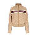 Felpa Guess da donna in colorazione sabbia con pattern del brand su tutto il capo e dettagli con fasce sul davanti in contrasto di colore. Modello con collo alto, chiusura sul davanti con cerniera, comode tasche laterali, maniche lunghe con polsini, fondo con orlo dritto e molla elastica in vita. Tessuto in misto Poliestere.
