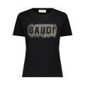T-shirt Gaudi da donna a tinta unita in colorazione nero con scritta del brand posta sul davanti realizzata con brillantini in contrasto di colore. Modello girocollo, maniche corte e fondo con orlo dritto. Tessuto in misto Cotone.