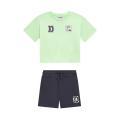 Completo Diadora da bambina in colorazione verde e nero. Modello con t-shirt girocollo, stampe del brand sul petto in contrasto di colore, maniche corte e fondo con orlo dritto. Bermuda con molla elastica in vita con lacci e stampa del brand posta sulla gamba in contrasto di colore. Tessuto in Cotone.