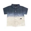 Camicia Daniele Alessandrini da bambino in colorazione blu e bianco con classico logo del brand cucito lateralmente in contrasto di colore. Modello con classico colletto, chiusura sul davanti con bottoni, taschini sul petto, maniche corte e fondo con orlo dritto.