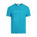 T-shirt Bikkembergs da uomo a tinta unita in colorazione celeste con scritta del brand posta sul davanti in tono su tono. Modello girocollo, maniche corte e fondo con orlo dritto. Tessuto in Cotone.