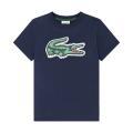 T-shirt Lacoste da bambino a tinta unita in colorazione blu con grande stampa del brand posta sul davanti in contrasto di colore. Modello girocollo, maniche corte e fondo con orlo dritto. Tessuto in Cotone.