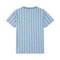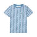 T-shirt Lacoste da bambino in colorazione indaco con pattern e disegni su tutto il capo e classico logo del brand cucito sul petto in contrasto di colore. Modello girocollo, maniche corte e fondo con orlo dritto. Tessuto in Cotone.