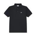Polo Lacoste da bambino a tinta unita in colorazione nero con classico logo del brand cucito sul petto in contrasto di colore. Modello con classico colletto con bottoncini, maniche corte e fondo con orlo dritto. Tessuto in Cotone.