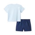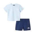 Completo The North Face da neonato in colorazione cielo e blu. Modello con t-shirt con logo del brand posta sul petto e sul retro, girocollo, maniche corte e fondo dritto. Bermuda con classico logo sulla gamba in contrasto di colore e molla elastica in vita. Tessuto in Cotone.